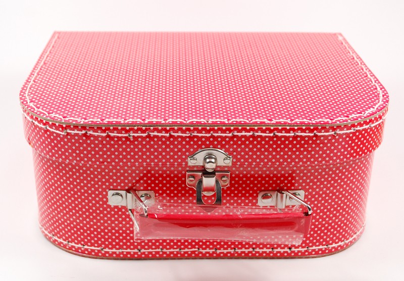 There are two models of cardboard suitcase in these kits, both have a polka dots desing, the pink one is the small size and the red one is the large one.