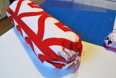 Then make some maths: I have made each pillow cover from one piece of fabric closed in both sides using a cord or a trim making a bow like a sweet. I needed the piece of fabric long enough to go around the pillow and wide enough to cover both sides of them making also some hem to put the cords inside. I have added about 2” around to have some seam allowance. To calculate the wide of the piece I have done the following: pillow wide + half of each side + hem, remember must be bigger than usually to introduce the cord. Total 18 + 3 + 3 + 0.5 + 0.5 = 25 inches.