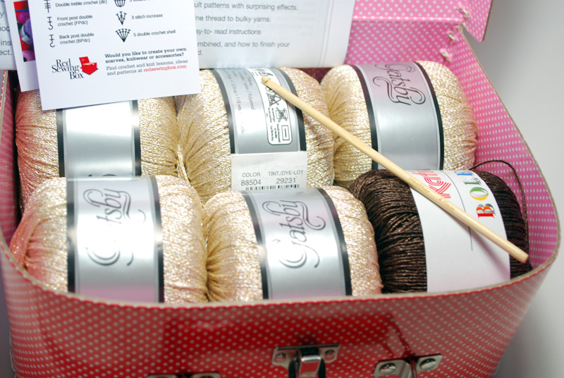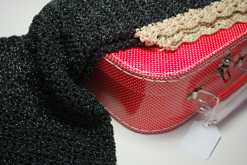 The yarn kit includes all the yarn that you will need to make it, and a FREE pretty red-polka-dots suitcase… and a FREE hook! … and ALSO FOR FREE you will get the pattern to crochet this little piece of art that will fit you in your jeans and in a prom dress!
