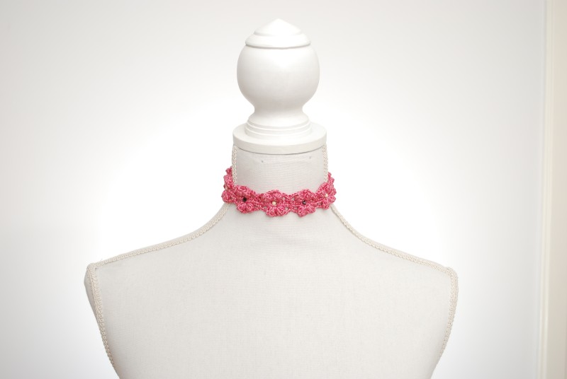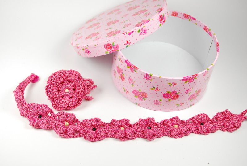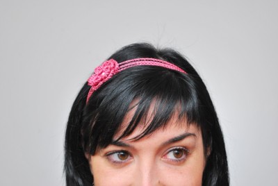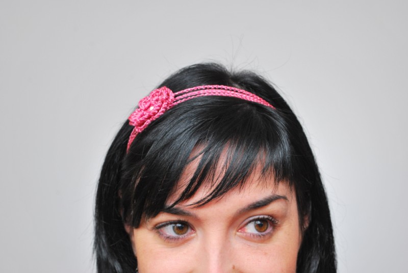 El rosa es uno de mis colores favoritos, especialmente este hilo brillante, muy fácil de trabajar y crear diferentes formas como esta bonita diadema de doble flor y la gargantilla con cuentas negras de Swarovski y otras plateadas.