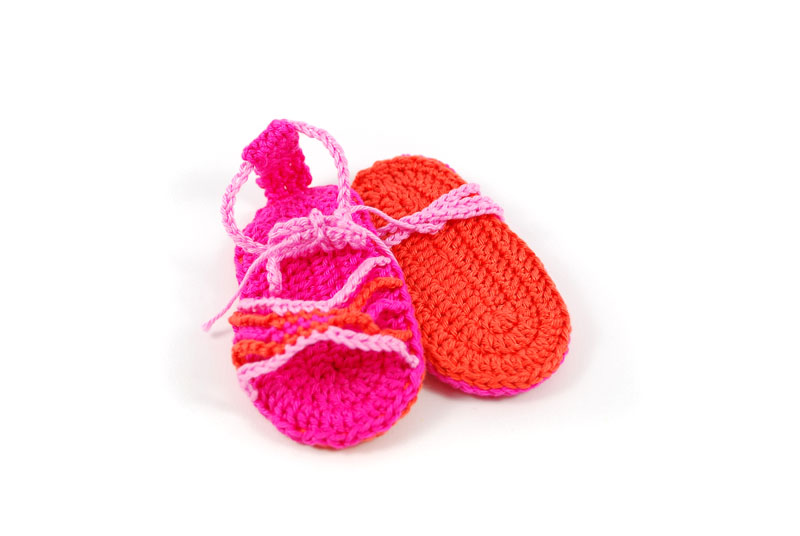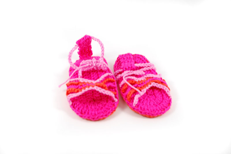 Este par de sandalias de tiras en tonos morado y frambuesa están tejidas en algodón puro.