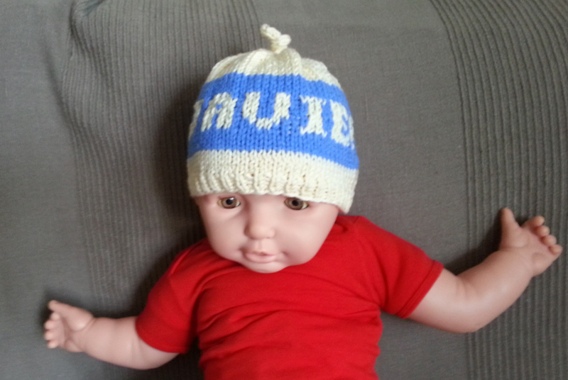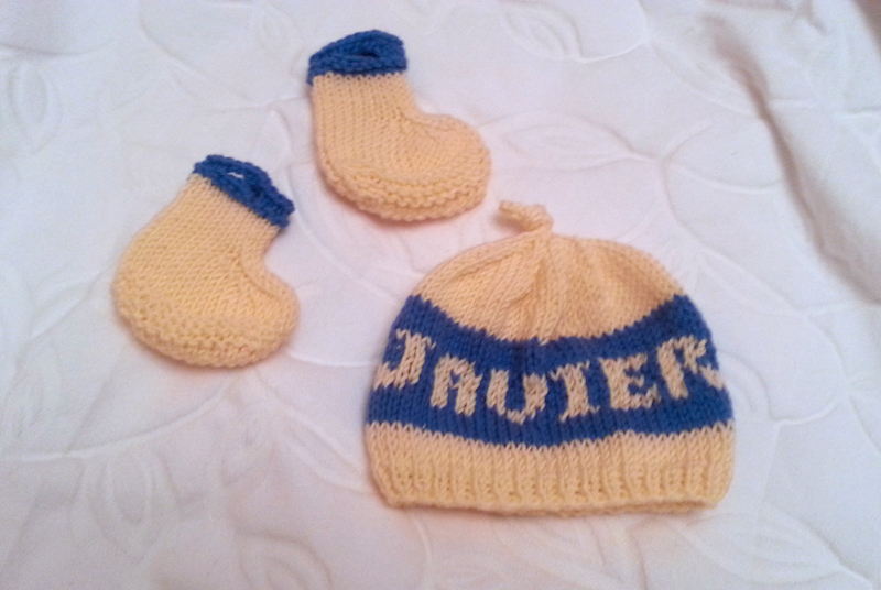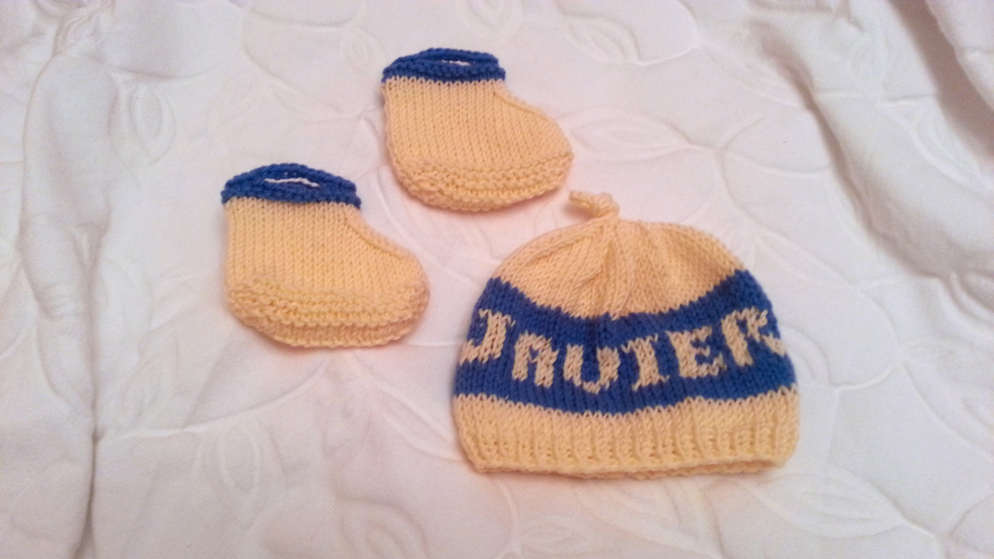 También terminé un gorrito con nombre para bebé, Javier, y diseñé un par de botitas con asas a punto, a juego con el gorrito. Mis primeros patrones de punto, que pueden necesitar ser testados.